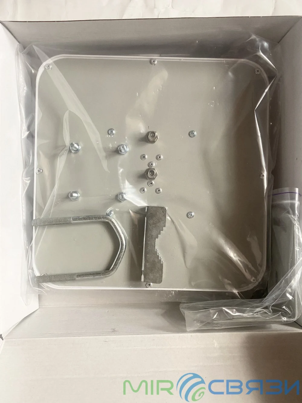 Крепеж в комплекте: угол 90″ и хомут для мачты с регулировкой вокруг поляризационной оси и по азимуту.